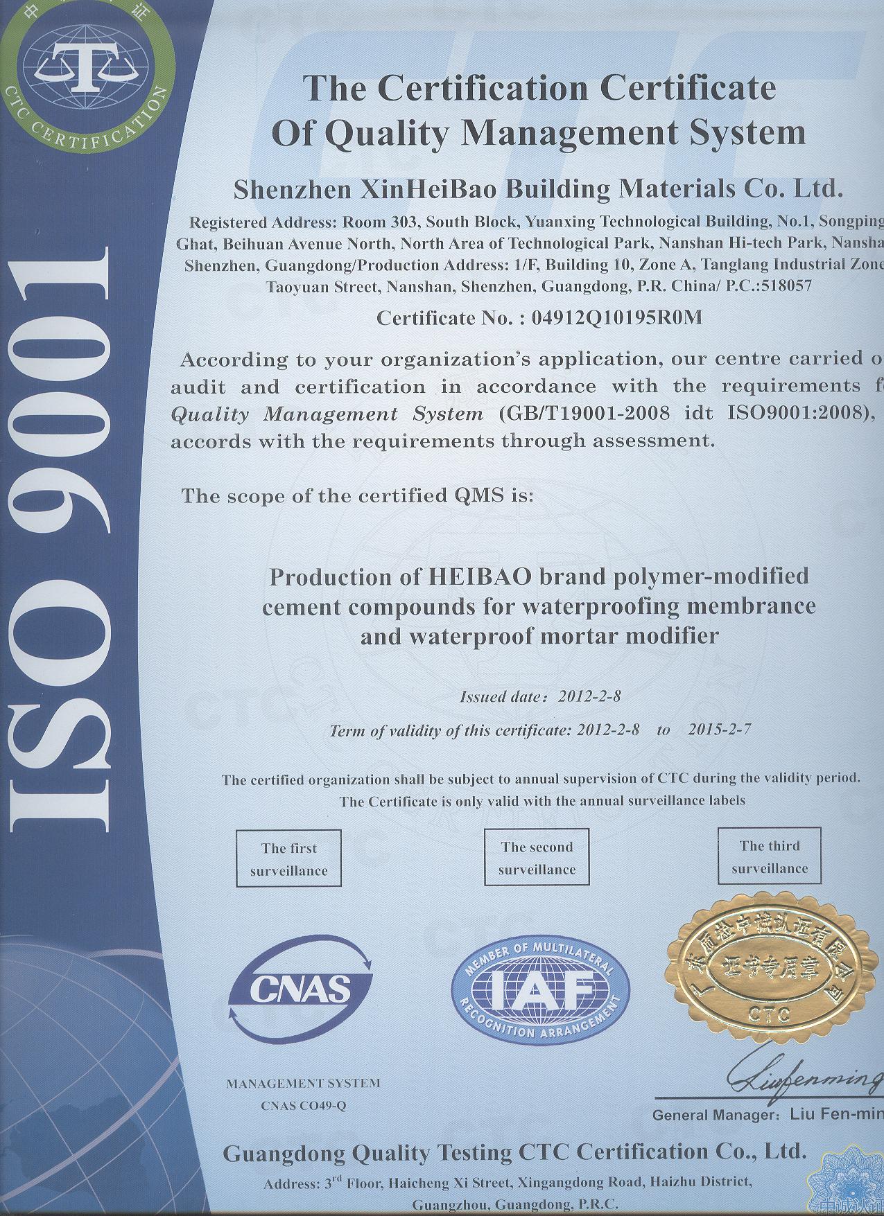 我公司2012年2月8日獲得ISO9001質(zhì)量管理體系認(rèn)證證書