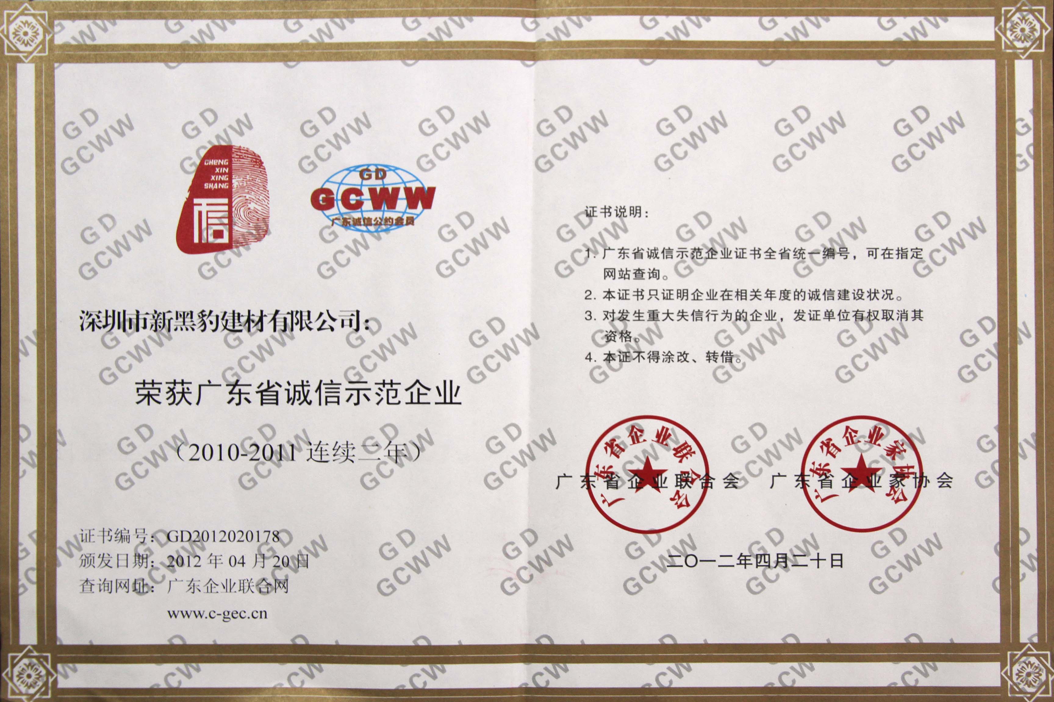為深入貫徹落實(shí)黨的十七屆六中全會(huì)和省委十屆十一次全會(huì)精神,促進(jìn)我省企業(yè)和企業(yè)家在“十二五”時(shí)期加快轉(zhuǎn)型升級(jí),建設(shè)幸福廣東,構(gòu)建全省企業(yè)誠(chéng)信體系以及發(fā)揮雇主組織有效參與社會(huì)管理的作用,廣東省企業(yè)聯(lián)合會(huì)、廣東省企業(yè)家協(xié)會(huì)決定對(duì)為廣東經(jīng)濟(jì)社會(huì)發(fā)展作出突出貢獻(xiàn)的2011年度廣東省優(yōu)秀企業(yè)、優(yōu)秀企業(yè)家、最佳誠(chéng)信企業(yè)、誠(chéng)信示范企業(yè)、先進(jìn)雇主組織予以表彰。 經(jīng)認(rèn)真評(píng)選推薦和總隊(duì)嚴(yán)格審核,深圳市新黑豹建材有限公司光榮的獲得了“2011年度廣東省誠(chéng)信示范企業(yè)”榮譽(yù)稱號(hào)!