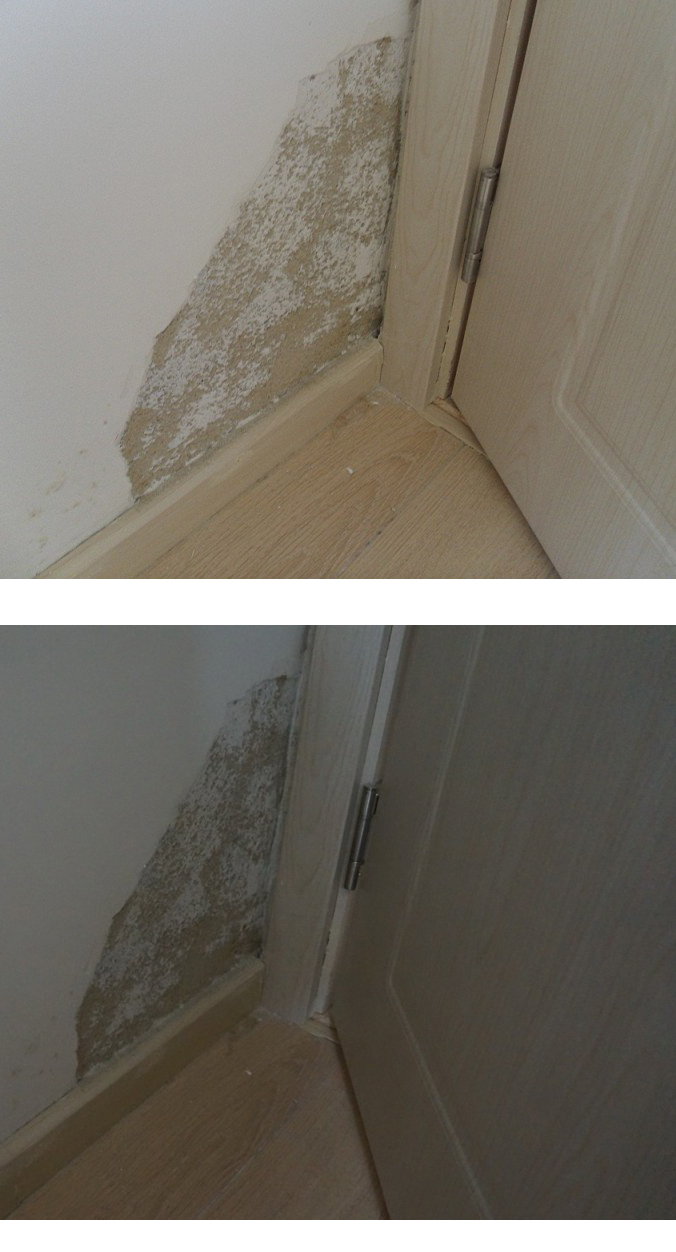 記者在現(xiàn)場看到, 410號房和718號房同樣位置,墻壁重新修補(bǔ)粉刷的痕跡明顯,2912房間墻角處的剝落仍未修補(bǔ),2916房未見明顯的滲水痕跡。中海相關(guān)負(fù)責(zé)人解釋,410號房的墻壁問題,是由于該墻壁外接露臺,前期施工中露臺與墻壁間存在縫隙導(dǎo)致滲水,718房間的滲水,是因?yàn)楣┧艿澜涌诖嬖趩栴};而2912墻角處的剝落,目前尚未查清究竟是供水管道滲水,還是建筑工人用水不當(dāng)導(dǎo)致墻壁被浸泡。