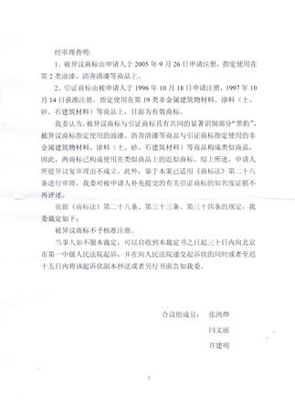 國(guó)家工商行政管理總局商標(biāo)評(píng)審委員會(huì)認(rèn)為“黑豹皇”商標(biāo)指定使用的油漆、瀝青清漆等商品與我公司“黑豹”商標(biāo)指定使用的非金屬建筑物材料、涂料(土、砂、石建筑材料)等商品構(gòu)成類似商品,并依據(jù)《商標(biāo)法》第二十八條、第三十三條、第三十四條的規(guī)定,國(guó)家工商行政管理總局商標(biāo)評(píng)審委員裁定“黑豹皇”商標(biāo)不予核準(zhǔn)注冊(cè)。