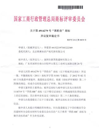 關(guān)于“黑豹皇”商標(biāo)異議裁定書