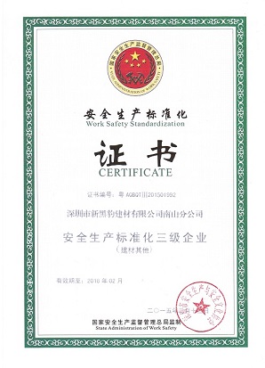 一直以來,我公司把安全生產(chǎn)和產(chǎn)品質(zhì)量都放在首位,我們不斷地規(guī)范生產(chǎn)流程,改善工作環(huán)。通過多次審核,我公司的位于深圳的生產(chǎn)基地深圳市新黑豹建材有限公司南山分公司被評(píng)為安全生產(chǎn)標(biāo)準(zhǔn)化三級(jí)企業(yè)。