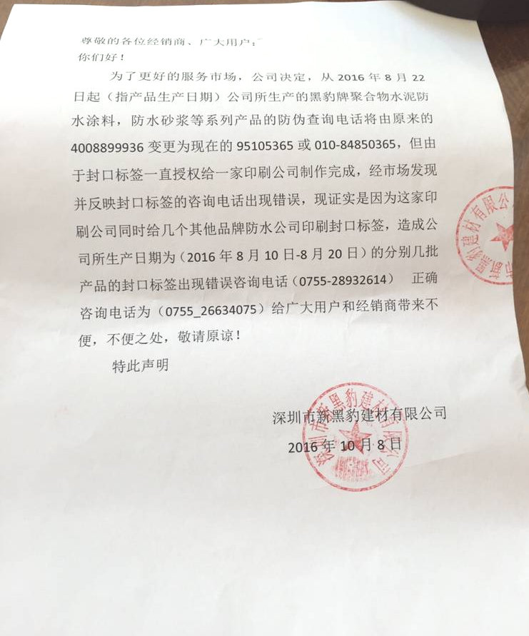 您們好,最近,有一些不法分子,假借我公司名譽私刻我公司公章,在社會上散發(fā)更改防偽查詢電話說明的文件(如下圖),說:“反映封口標(biāo)簽的咨詢電話出現(xiàn)錯誤”、“是印刷公司同時給幾個其他品牌防水公司印刷封口標(biāo)簽”所致,這簡直是一派胡言,我新黑豹建材有限公司,從來就沒有出現(xiàn)過這件事,沒有更換過封口條。我們只更換過防偽驗證碼,在更換時,工作非常仔細、非常嚴(yán)謹(jǐn),都是提前一個多月告訴消費者。因此請廣大客戶千萬別上當(dāng),同時,我們也會保留對不法分子追究法律責(zé)任的權(quán)利。