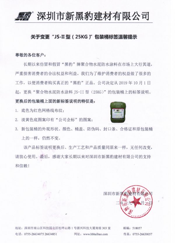 | 尊敬的各位客戶: 長期以來假冒和仿冒“黑豹”牌聚合物水泥防水涂料在市場上大行其道,嚴重損害消費者的合法權益和利益。我們?yōu)榱司S護消費者的權益做了很多的工作,以便消費者購買真正的“黑豹”正品。公司決定從2019年10月1日起,更換“聚合物水泥防水涂料JS-II型(25KG)”的包裝桶上的標簽說明。 更換后的包裝桶上面的新標簽說明的特征是: 1.底色為紅色網(wǎng)格線布紋; 2.淡黃色底圖案印有“公司企標”的圖案; 3.新包裝桶的外觀形狀、顏色、桶蓋、防偽碼、封口條、合格證和原包裝桶上的一樣,仍然不變。 該產(chǎn)品標簽說明更換后、生產(chǎn)工藝和產(chǎn)品質(zhì)量同原來一樣,無任何改變。請放心使用。最后,感謝大家長期以來對深圳市新黑豹建材有限公司的支持和信賴!