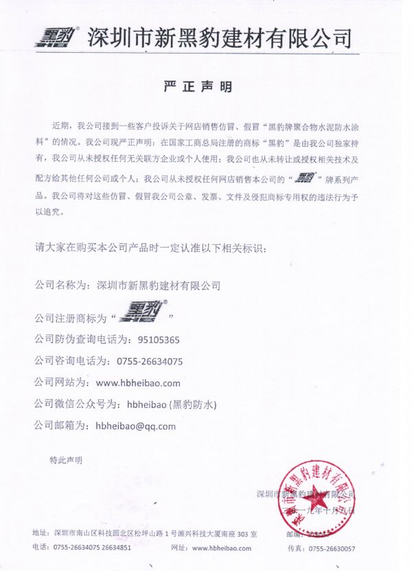 公司防偽查詢電話為:95105365 公司咨詢電話為:0755-26634075 公司網(wǎng)站為:www.cowandmonkey.com 公司微信公眾號(hào)為:hbheibao (黑豹防水) 公司郵箱為:hbheibao@qq.com 特此聲明 深圳市新黑豹建材有限公司 二0一九年十月八日